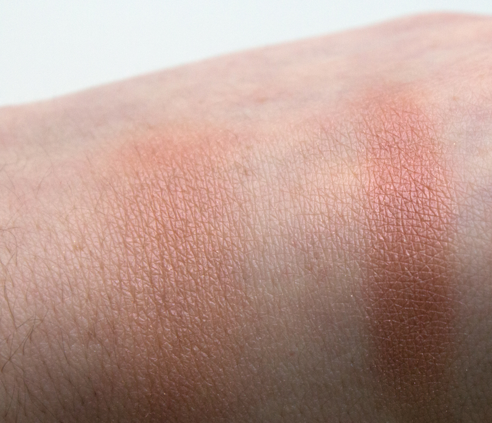 Passons maintenant au vif du sujet, le blush. Il est très bien travaillé c’est très beau je trouve avec cet effet de relief et ces irisés. Ceux-ci peuvent faire peur d’ailleurs au premier abord. On n’a pas trop envie de se retrouver avec une joue disco. Rassurez-vous les irisés du dessus partent presque à la première utilisation. Quand on voit la couleur dans le pot on voit une sorte de rose un peu mauve froid, parfait pour tous les jours et toutes les carnations. Mais une fois qu’on passe son doigt dessus c’est une couleur beaucoup plus pêche qu’on retrouve. J’ai été très surprise sur le coup. swatch-rockateurComme vous pouvez le constater sur les swatchs ci-dessus on a une couleur assez orangée. On retrouve quand même des tons rosés, c’est un beau mixte et c’est ce qui rend ce blush universel je trouve. Il a un fini légèrement satiné et lumineux très flatteur pour le visage. Ça réveille le teint de façon naturelle. Je mets quand même de l’highlighter car j’aime avoir un teint plus lumineux encore. Niveau texture il est très velouté, c’est très agréable au toucher et on sent que c’est de la qualité. Il est pigmenté mais pas non plus à outrance ce qui permet de doser la couleur sans se rater. C’est pour moi le blush parfait pour les débutants qui ne savent pas trop vers quelle couleur se diriger et qui ont peur de se tromper.
