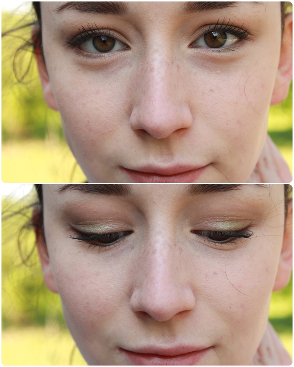 Troisième étape : Une petite touche lumière dans le coin interne que je viens fondre avec le vert. Vous pouvez utiliser un fard très lumineux pour donner un coup de frai encore plus intense mais j’ai voulu utiliser exclusivement cette palette alors j’ai pris le fard le plus clair qui n’est malheureusement pas très pigmenté et un peu poudreux.