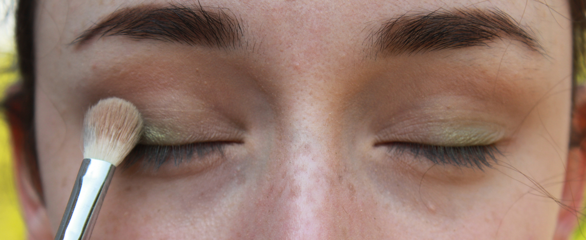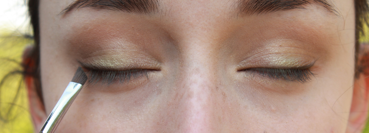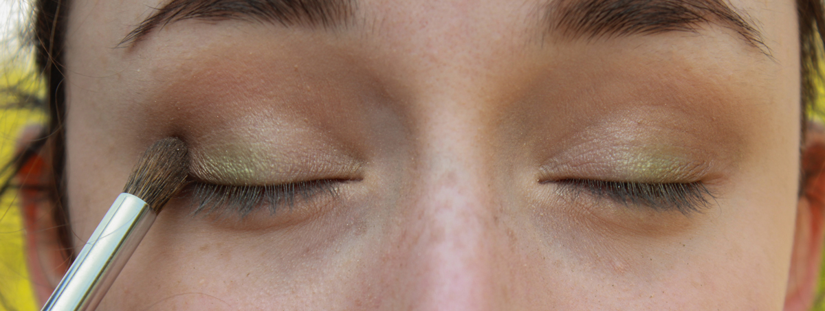 Deuxième étape : La couleur, ici le vert clair de la palette que j’applique sur ma paupière mobile environ au 3/4. C’est un vert très passe partout je l’applique avec le même pinceau mais un pinceau plat aurait été très bien aussi. Vous pouvez rajouter de la matière jusqu’à ce que la couleur vous plaise.