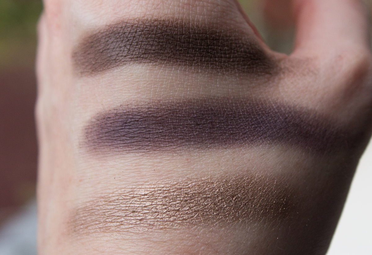 Ensuite on a Soul searching le premier irisé de la palette qui est un taupe superbe et lumineux. Ensuite Elegant chaos un violet profond superbe. Et Eshes awake un marron froid foncé.