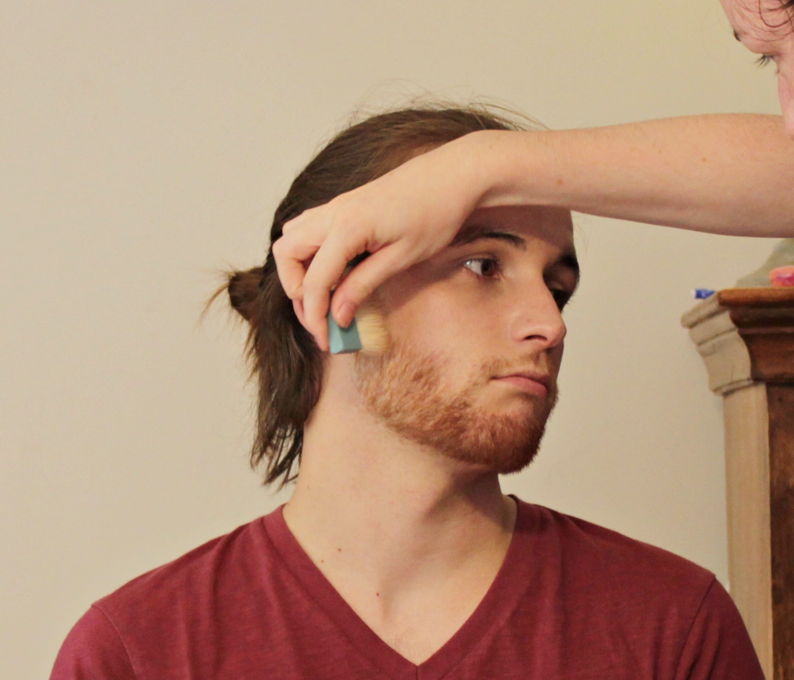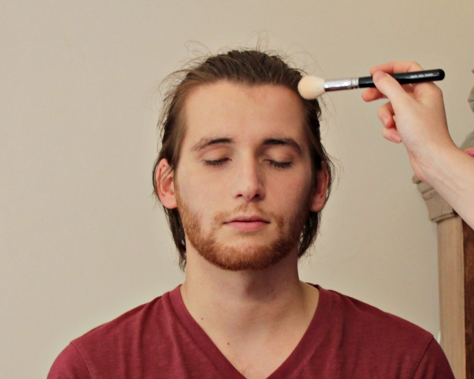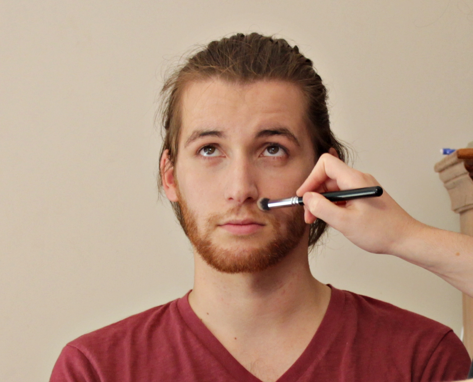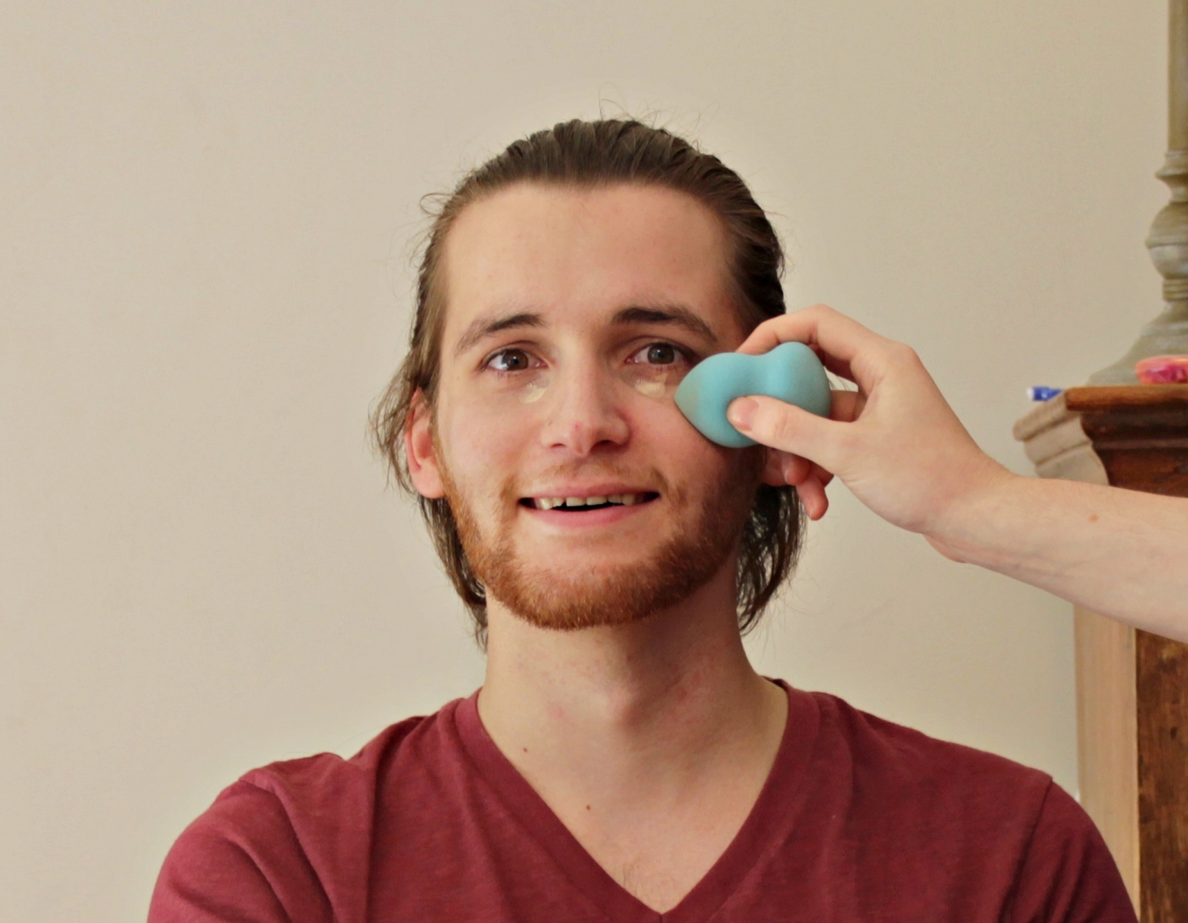 Commencez par appliquer de l’anti-cerne de préférence liquide et non crème car cela se fond plus à la peau et c’est plus naturel. Je travaille à l’éponge (mouillée) car ça permet de fondre totalement la matière à la peau et c’est le rendu le plus naturel que je connaisse. (il faut un drôle de tête car l’éponge et le tapotement c’est étrange et nouveau pour lui) Allez-y graduellement en superposant, ne déposez par trop de matière d’un coup.